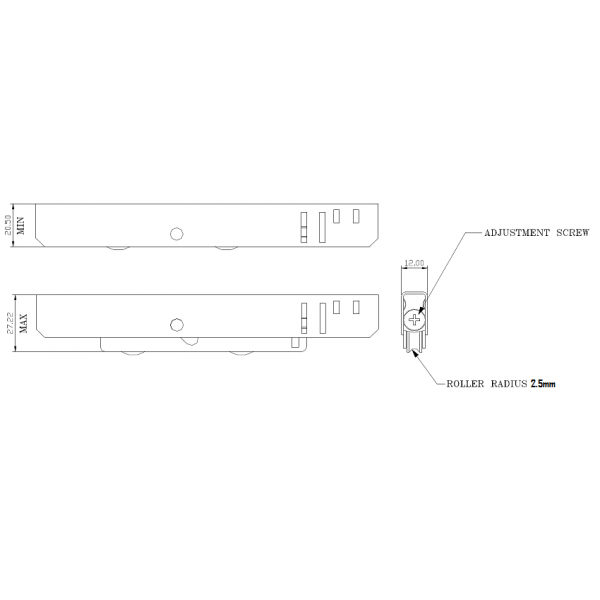 The slimeline (eurogroove) patio door roller with a stainless steel body and stainless steel wheels, perfect all round replacement to worn and damaged patio door wheels, adjustable screw on the back to raise and lower the wheel set to the desired height between 20.50mm to 27.22mm.