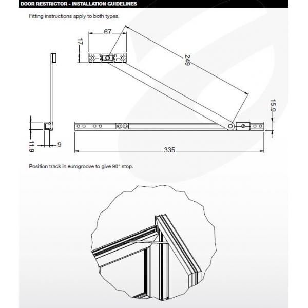Restrictor limits door opening to a preset position or to maximum of 90 degrees